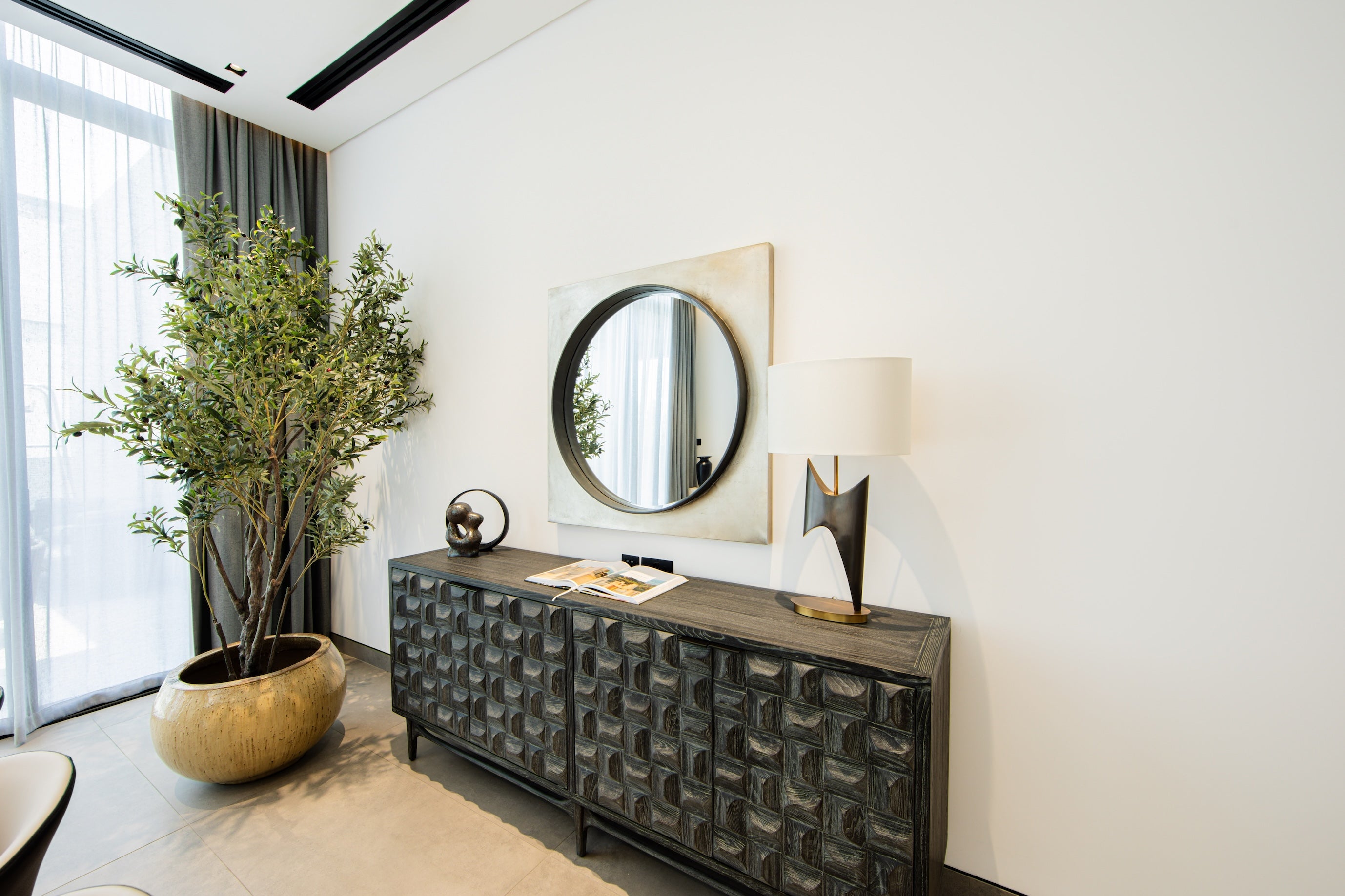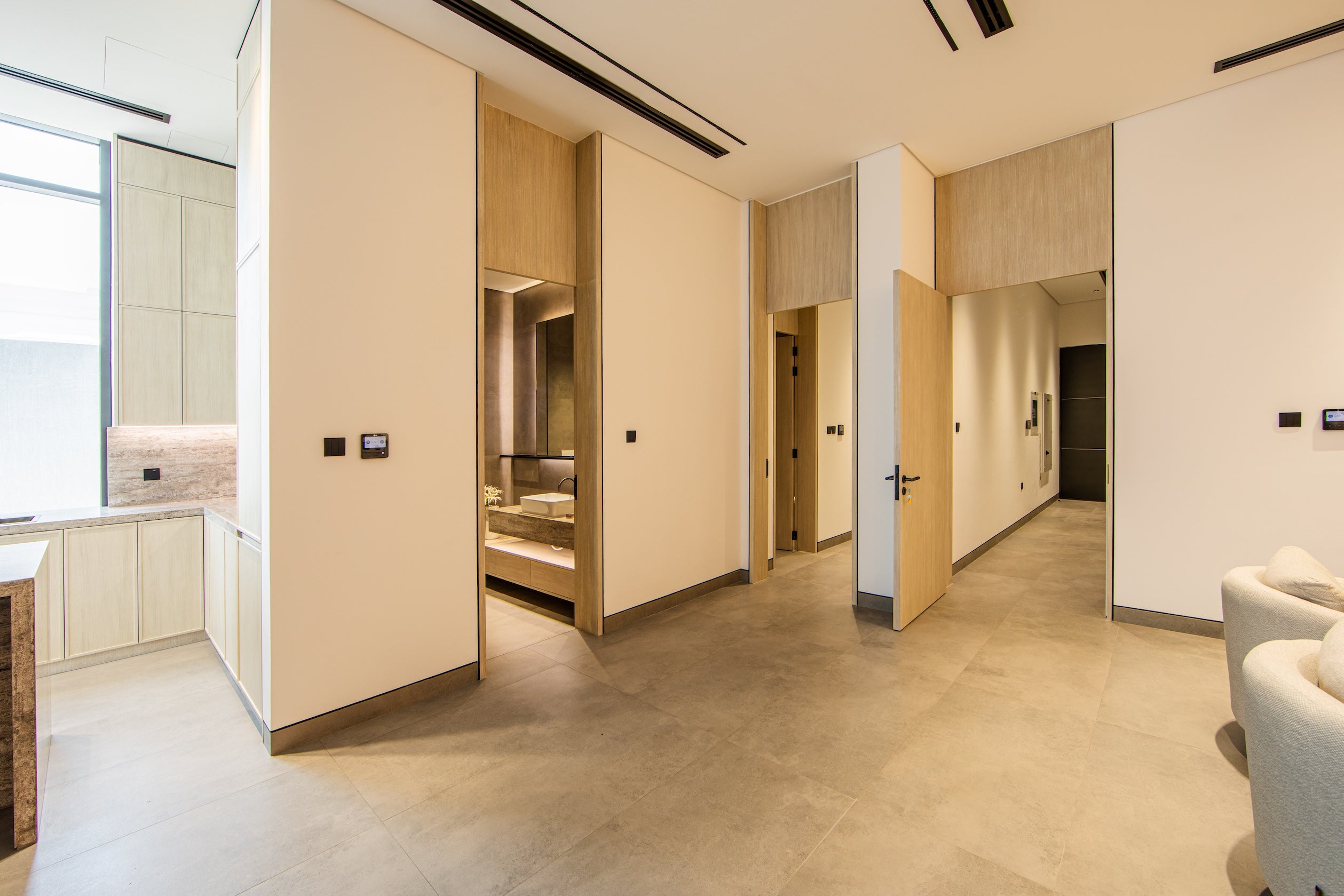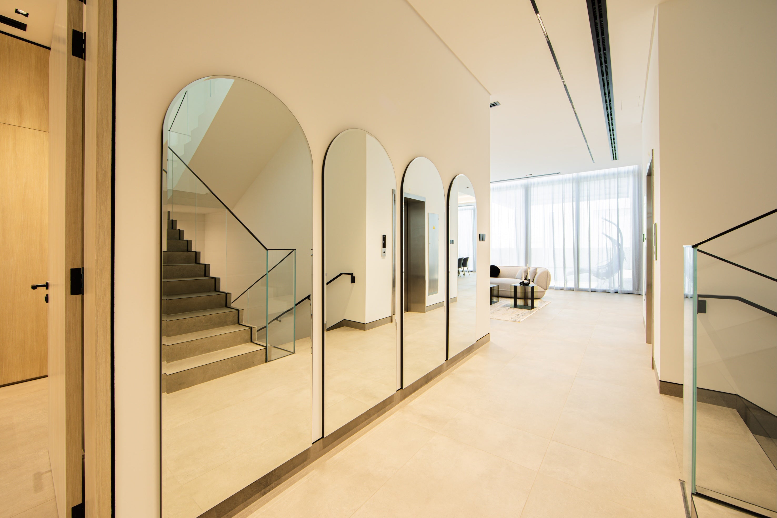 Enter through the main door to find the separate apartment-style area, featuring a cozy living and dining space, an open-plan kitchen, and a spacious ensuite bedroom. Access the house’s utility entrance from the rear, where you’ll find the staff room and private elevator.
